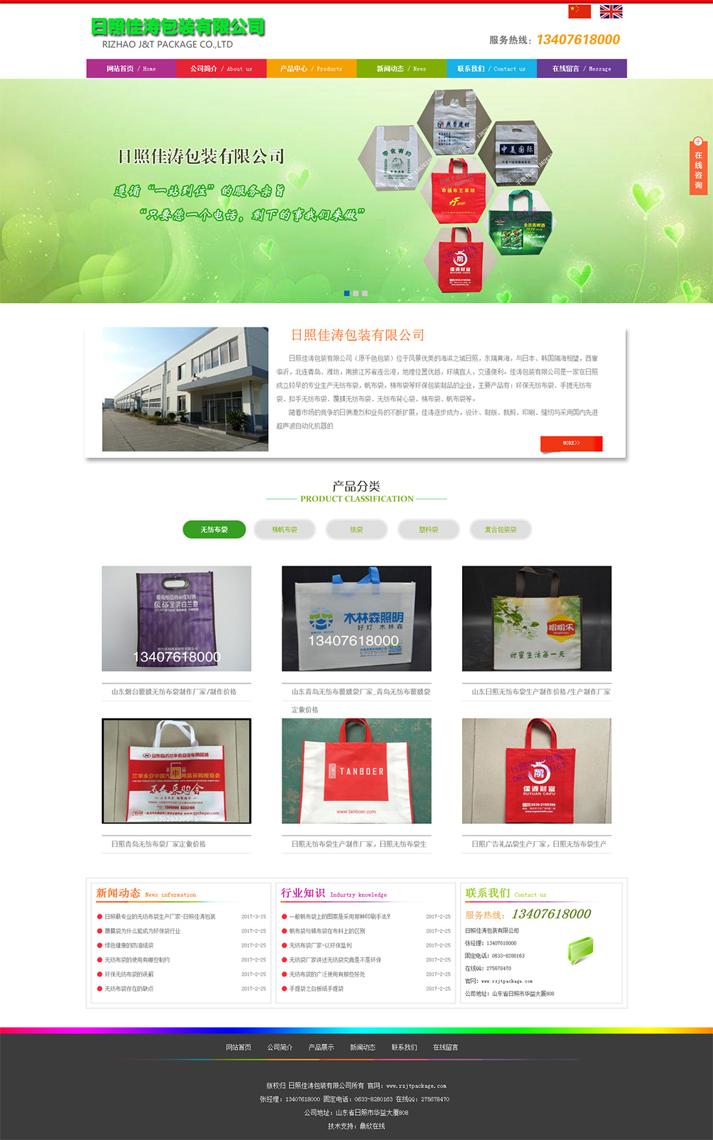 • 日照佳濤包裝有限公司(原千色包裝)位于風(fēng)景優(yōu)美的海濱之城日照,東隔黃海,與日本、韓國(guó)隔海相望,西靠臨沂,北連青島、濰坊,南接江蘇省連云港,地理位置優(yōu) 越,環(huán)境宜人,交通 便利。佳濤包裝有限公司是一家在日照成立較早的生產(chǎn)無(wú)紡布袋,帆布袋,棉布袋等環(huán) 保包裝制品的企業(yè),主要產(chǎn)品有:環(huán) 保無(wú)紡布袋、手提無(wú)紡布袋、扣手無(wú)紡布袋、覆膜無(wú)紡布袋、無(wú)紡布背心袋、棉布袋、帆布袋等。