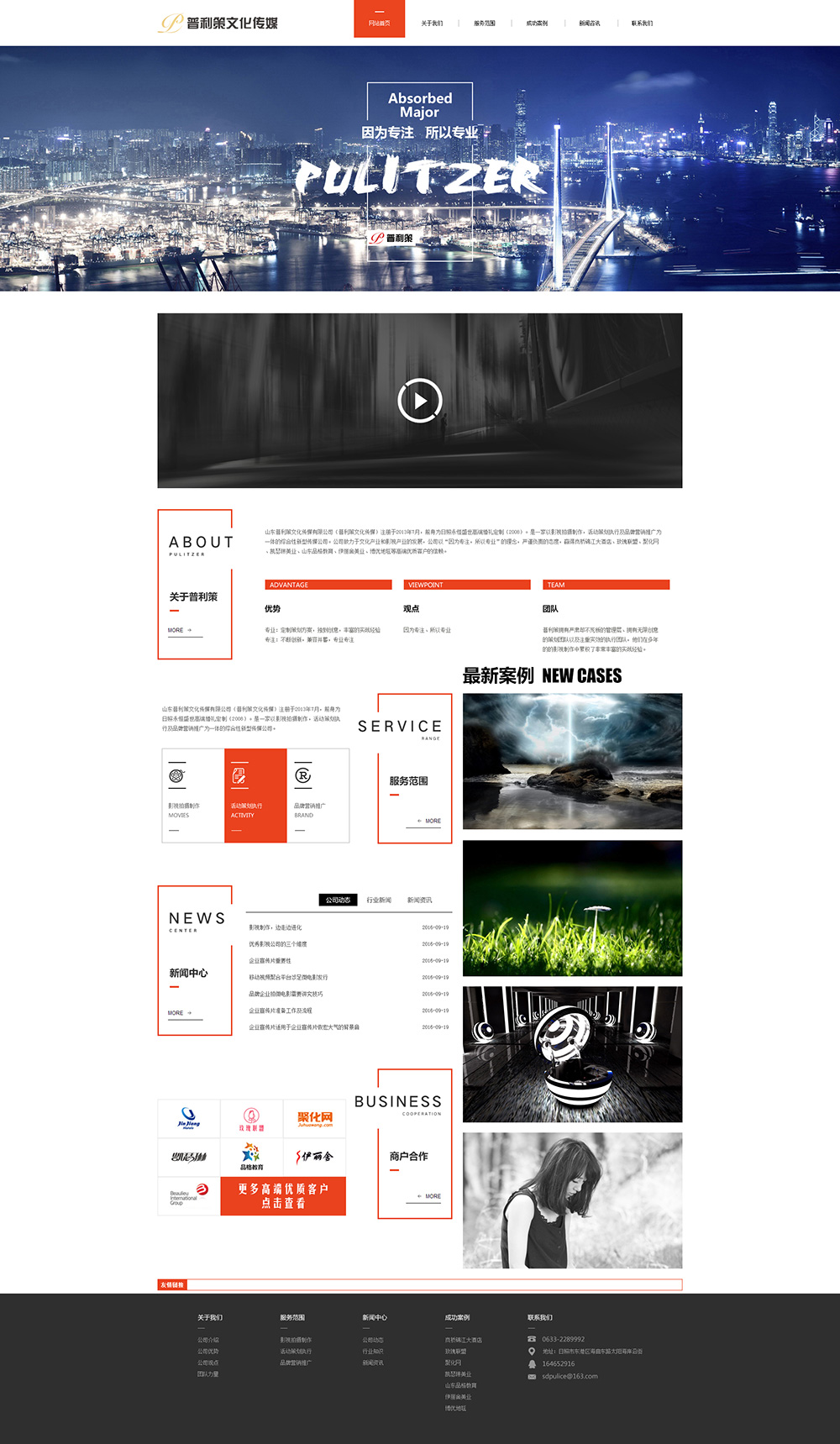 • v山東普利策文化傳媒有限公司(普利策文化傳媒)注冊于2013年7月,前身為日照永 恒盛世高 端婚禮定制(2008)。是一家以影視拍攝制作,活動策劃執(zhí)行及品牌營銷推廣為一體的綜合性新型傳媒公司。公司下置:策劃部,市場部,影視部及設(shè)計部四個部門。注冊3年來,致力于文化產(chǎn)業(yè)和影視產(chǎn)業(yè)的發(fā)展,公司以“因為專 注,所以專 業(yè)”的理念,嚴(yán)謹(jǐn)負(fù)責(zé)的態(tài)度,獲得了廣大 客戶的贊許和好評。